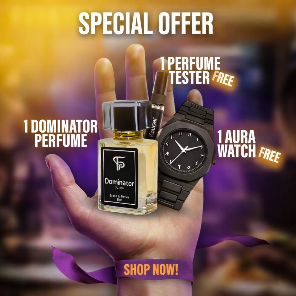 This exclusive offer includes a full-size Dominator Perfume, a complimentary tester to explore the fragrance, and a stylish Aura Watch — giving you both scent and style in one deal.